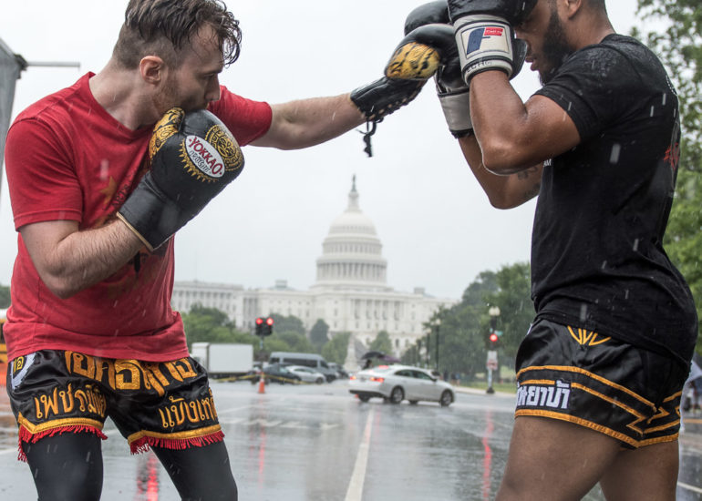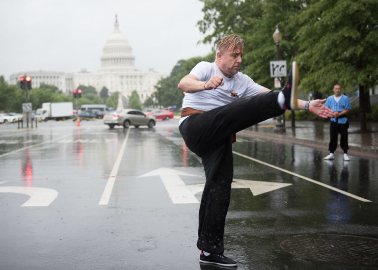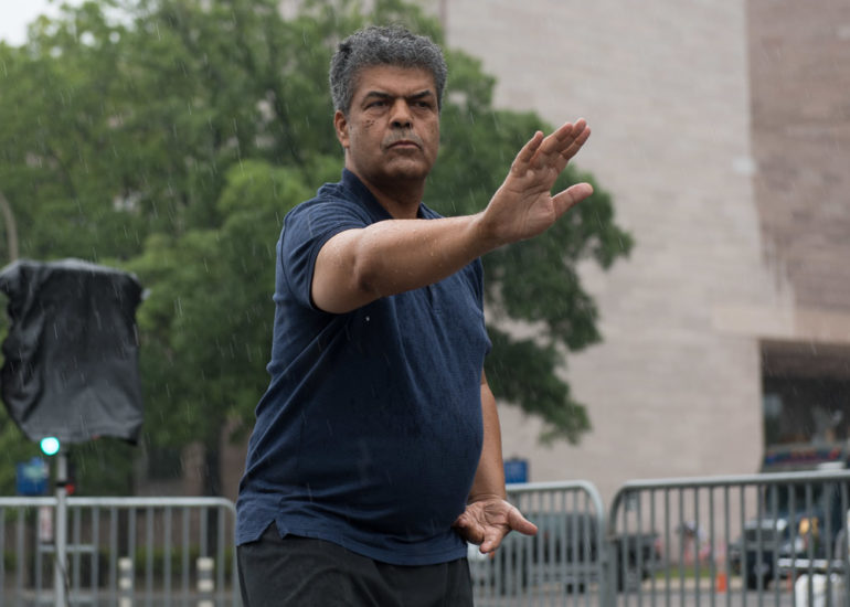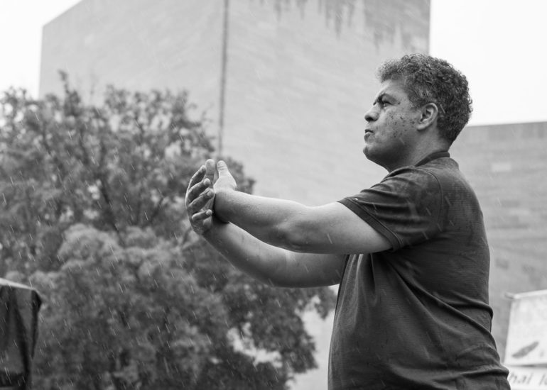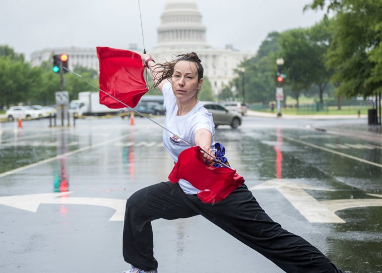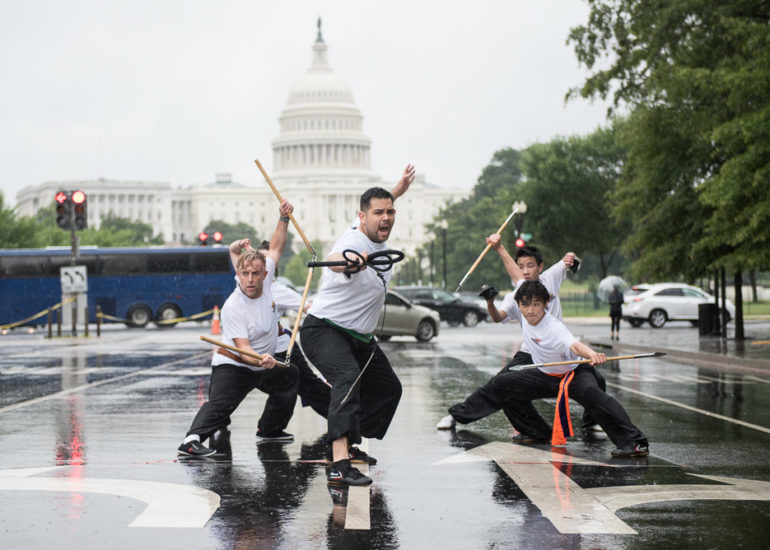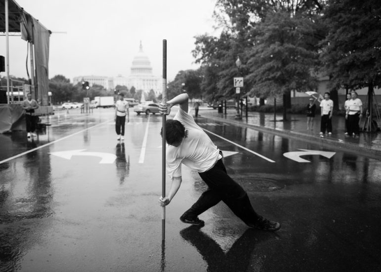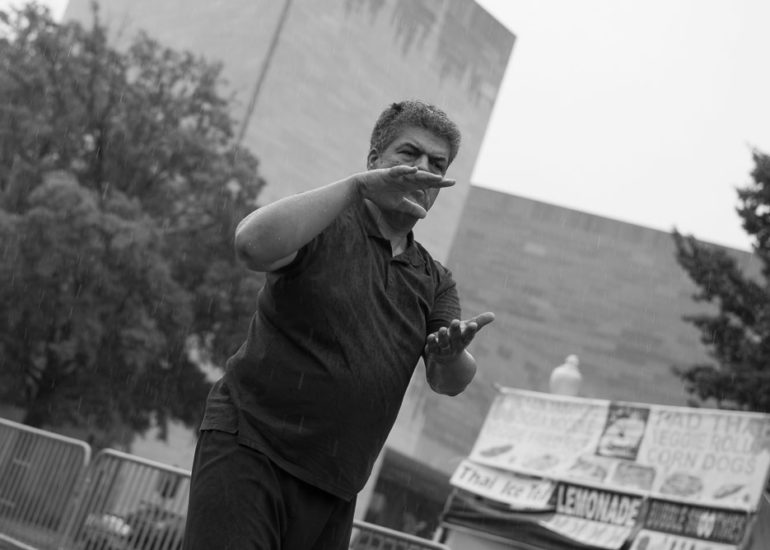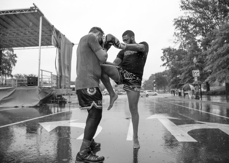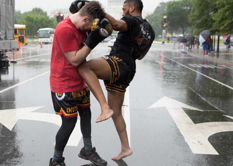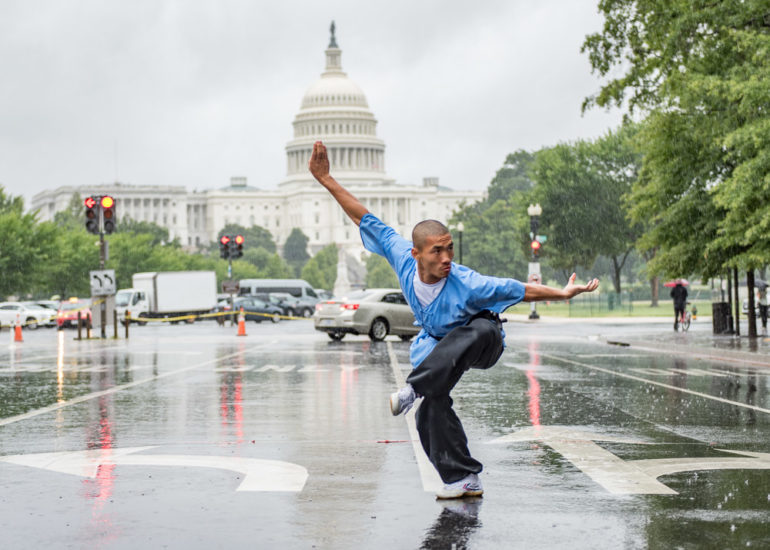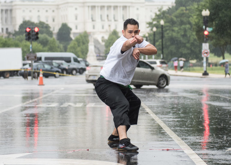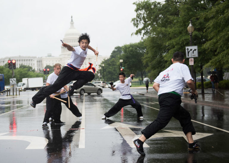 Martial Artists practice their craft in the rain.