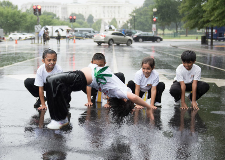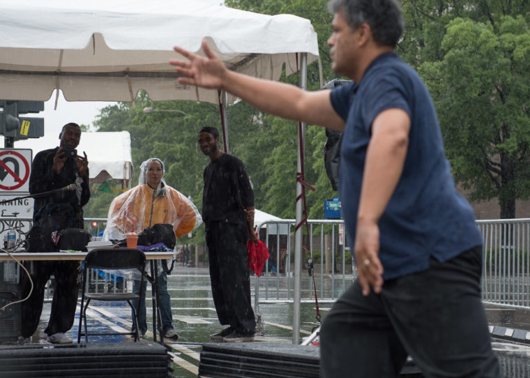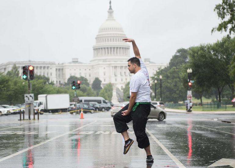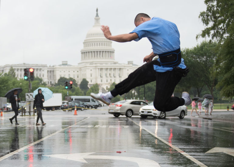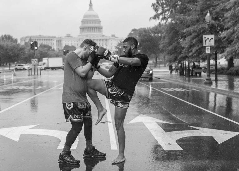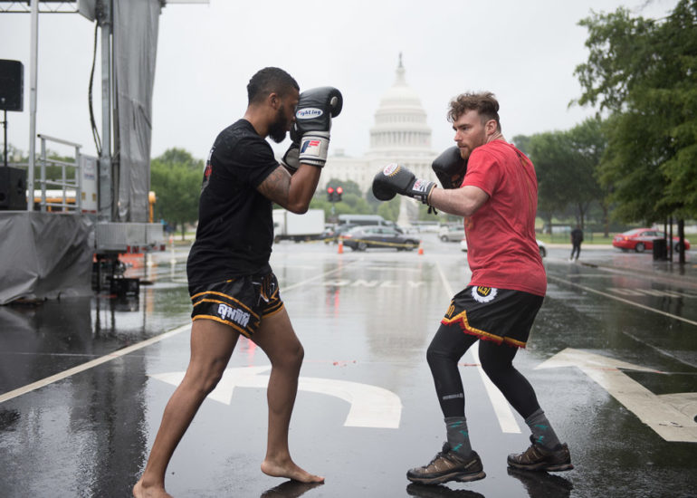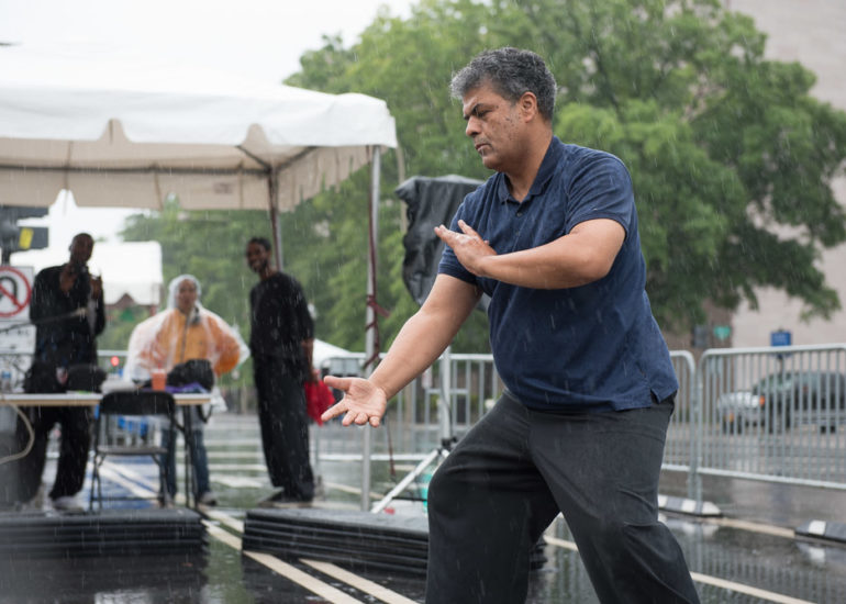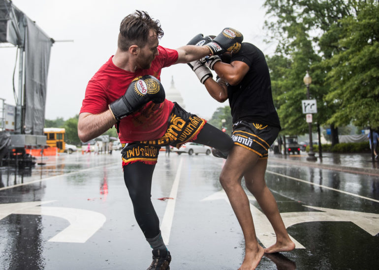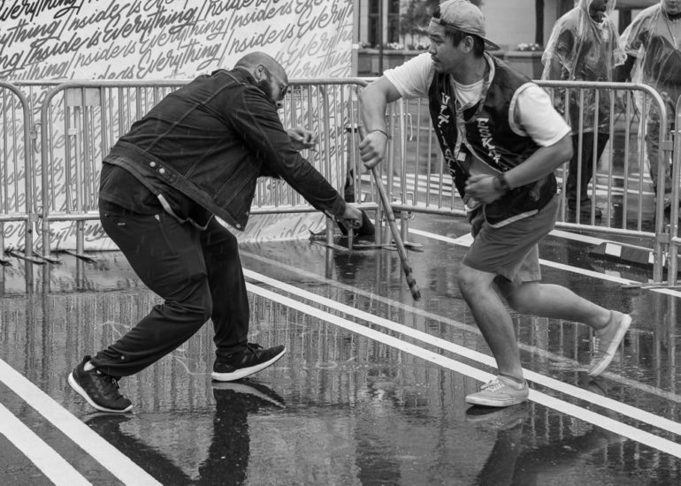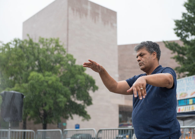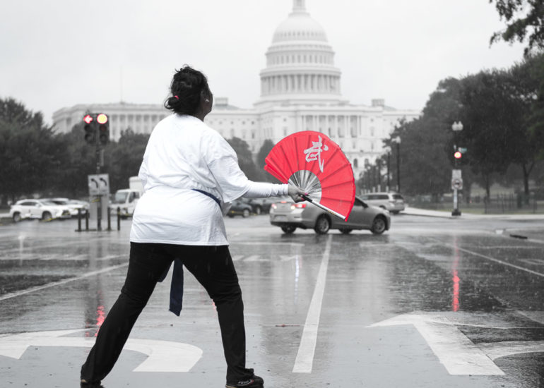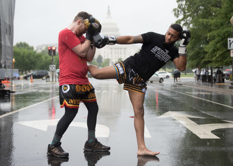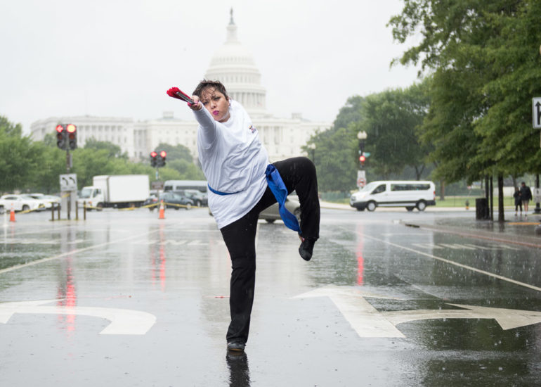 Martial Artists practice their craft in the rain.